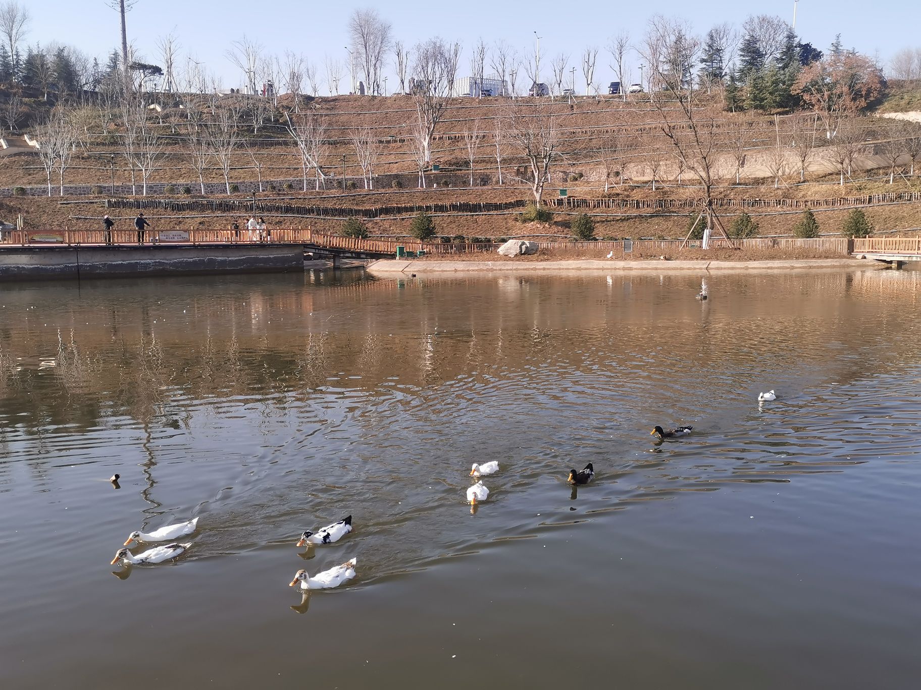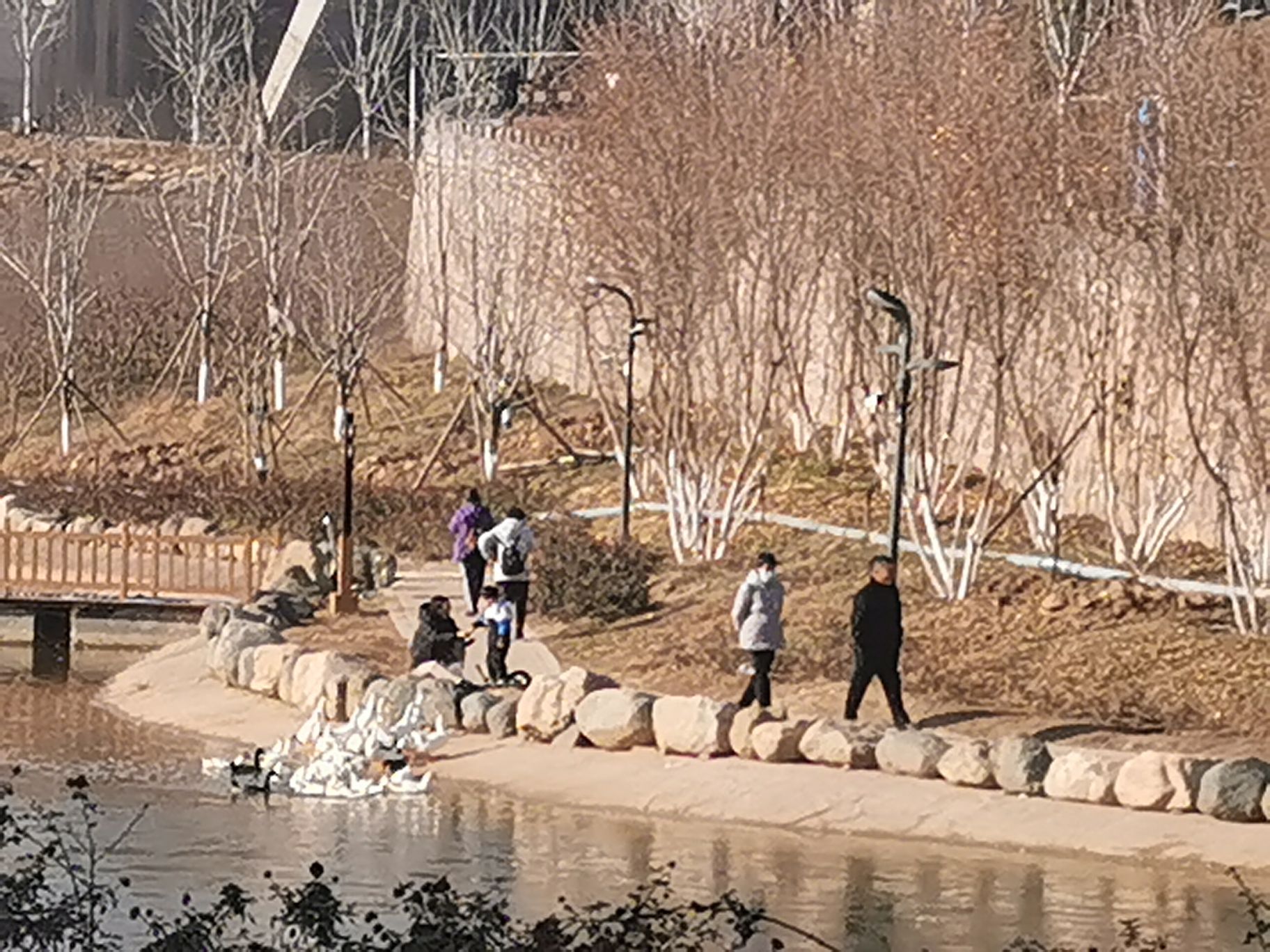 走過小橋便是臨水棧橋,原木護欄被游人摸得溫潤。護欄邊,兩位年輕媽媽扶著趴在欄桿上的孩子,孩童睜著好奇大眼睛,目光追著水中鴨群,咿呀軟語惹人憐愛。媽媽們輕聲回應,手指鴨群耐心講解,溫柔聲音伴著鴨鳴,譜成冬日溫潤樂章。陽光灑在她們身上,鍍上柔和光暈,歲月靜好的模樣,讓人不忍打擾。