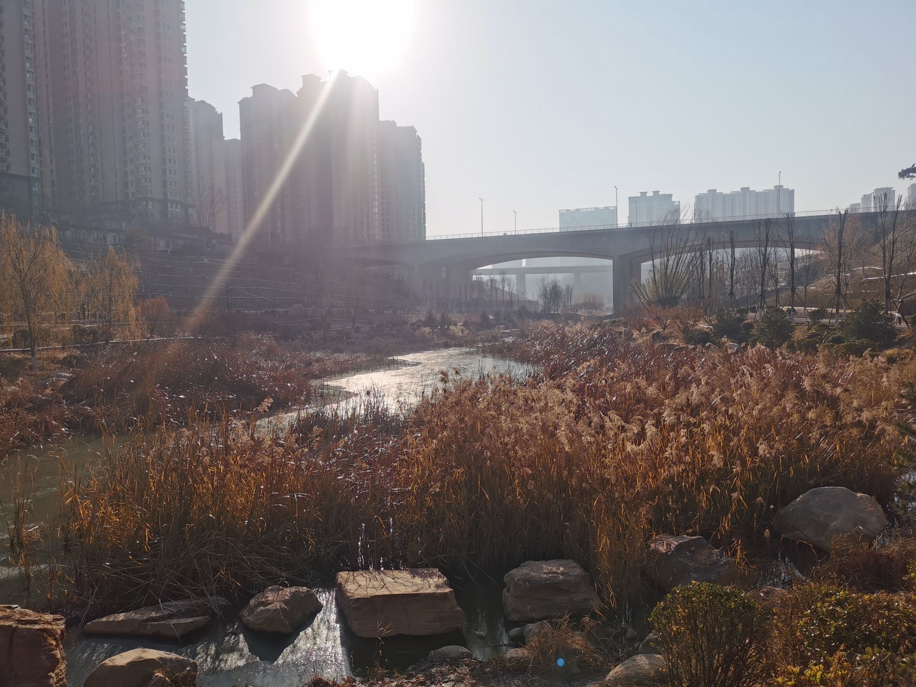早飯后,晨霧漸散,澄澈的天光灑向大地。我換上輕便的運動鞋,獨自前往青龍谷晨練。剛入公園,清冽寒氣裹挾著草木與泥土的干爽氣息撲面而來,深吸一口,五臟六腑都透著通透。石板路旁邊的草坪上,枯草綴滿細密霜花,如碎鉆鋪撒,初陽斜照其上,折射出點點銀光,忽明忽暗間,暖意在眼底流轉。