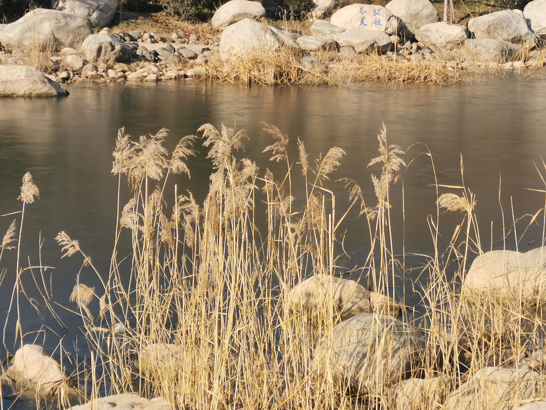 順河邊石板路前行,菖蒲與蘆葦交織成枯黃花海。菖蒲葉片雖枯卻依舊挺拔,如利劍直指天空;蘆花更為柔軟,微風一吹便輕搖致意。“蒹葭蒼蒼,白露為霜”,《詩經》的古意撲面而來,卻無凄清惆悵,反倒因暖陽映照多了暖意安寧。不時有不怕冷的小鳥在蘆花中啼鳴,清脆聲響穿透晨霧,為河谷注入生機。它們在葦叢中穿梭,黑白羽毛格外顯眼,偶爾停在葦稈抖落霜粒,振翅飛走后留下一串悅耳鳴叫。