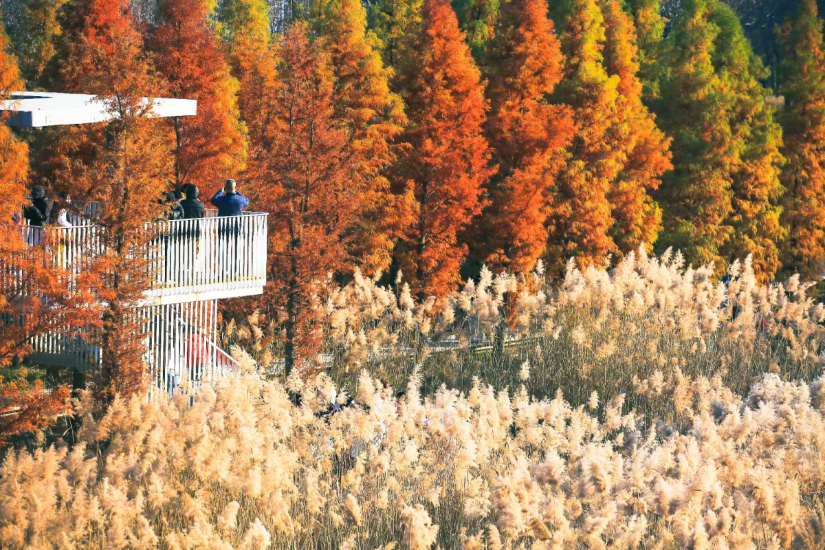 如果你最近路過東風渠生態文化公園,一定會被一片“水上森林”吸引。冬日的水杉林,褪去翠綠,換上橙黃與赭紅的“新裝”,在陽光下仿佛點燃了冬日的熱情。蜿蜒的親水步道旁,市民們駐足拍照、打卡,享受這份家門口的愜意與浪漫。
