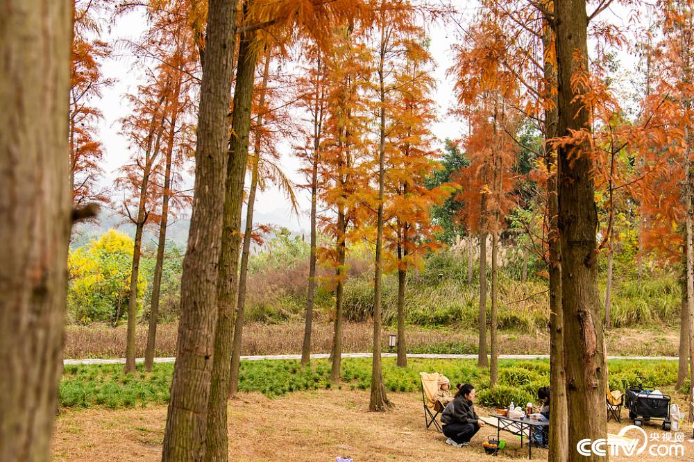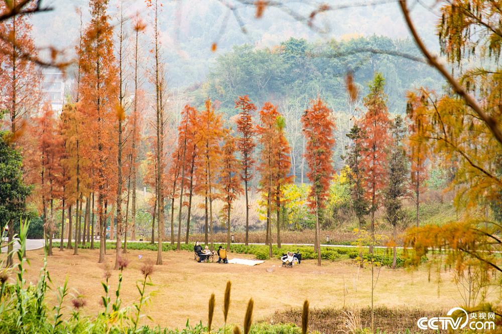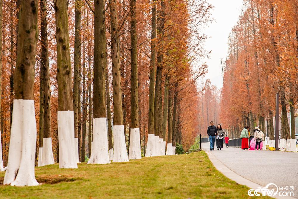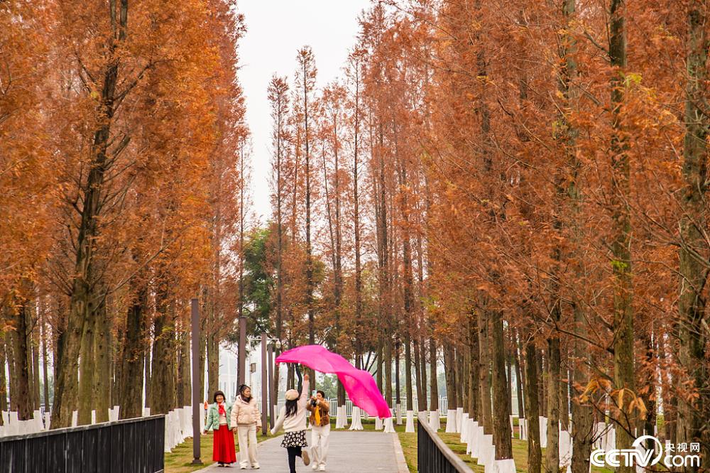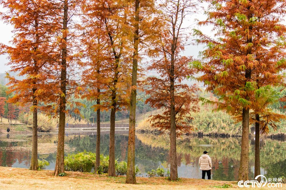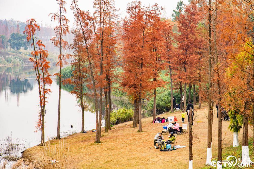 2025年12月16日,重慶市沙坪壩區菁云湖公園,成片的水杉樹色彩艷麗,景色如畫。視覺中國
