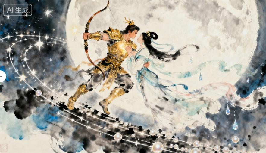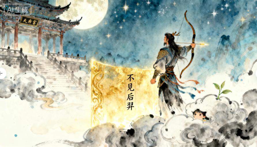 他領著云芽走到一塊青石旁坐下,開始講述那段塵封的往事:“當年,人間有十個太陽,百姓們苦不堪言。后羿是人間的勇士,他彎弓搭箭,射下了九個太陽,救了天下百姓。西王母為了獎勵他,賜給了他一粒長生不老的仙藥,告訴他,只要夫妻二人分著吃,就能一起長生;若是一人獨吃,就能飛升成仙?!?