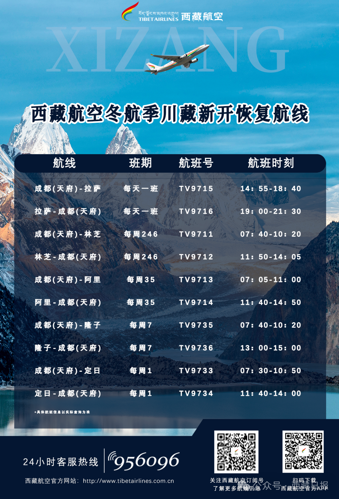 注:以上航線為西藏航空冬航季新開恢復的成都天府國際機場進出藏航線,原有的成都雙流國際機場進出藏航線(如成都雙流往返拉薩、林芝、昌都、日喀則等)照常運行。