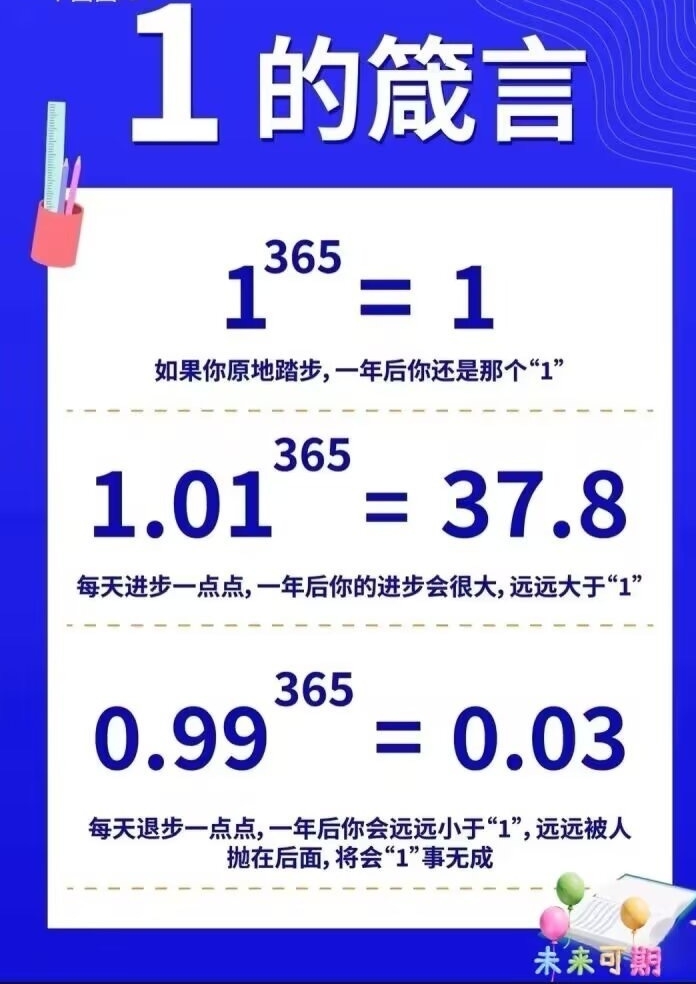 這應該是一張勵志海報或教育圖示的圖片,核心內容是以數學公式的形式,用“1”的365次方來比喻每天進步或退步帶來的長期影響。