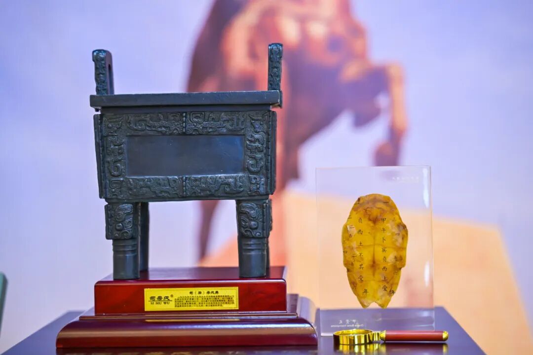 活動現場,司母戊公司文創產品“殷商文化三件套”——司母戊鼎、水晶甲骨文、竹簡易經驚艷亮相。以其精巧的設計和深厚的文化內涵,生動展現了安陽作為殷墟所在地的獨特文化魅力。