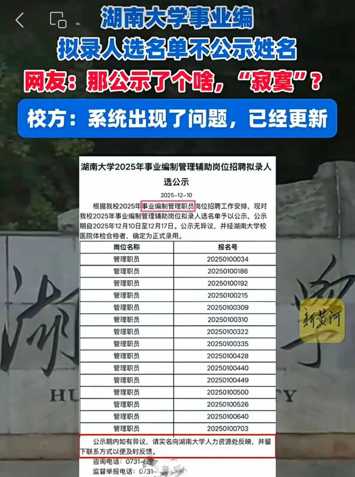 根據媒體此前報道,網友分享的視頻顯示,這份“湖南大學2025年事業編制管理輔助崗位招聘擬錄人選公示”文件里有兩列內容,分別為崗位名稱和報名號,公示期為12月10日至17日。不少網友質疑,報名號不具備公開查詢屬性,這樣的公示形式仿佛“公示了個寂寞”。