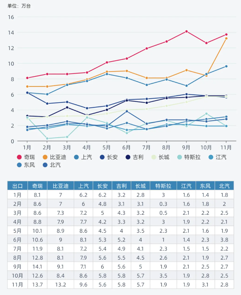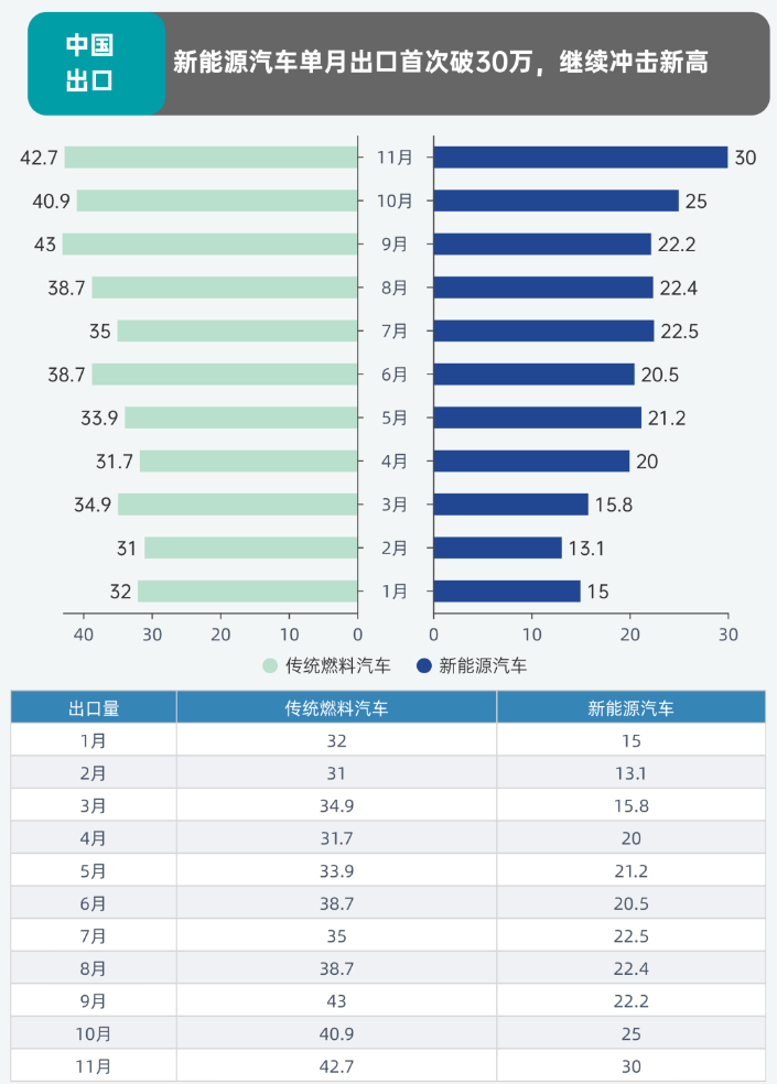中汽協(xié)的數(shù)據(jù)顯示,11月的新能源汽車出口達(dá)30萬輛,同比暴漲261.6%,占總出口量的41.2%。前11個月,累計出口達(dá)231.5萬輛,同比增長102.9%。燃油車在前11月累計出口402.8萬輛,同比下滑8%。這意味著,中國汽車出口的高增長,核心驅(qū)動力來自新能源汽車的爆發(fā)式增長,燃油車出口規(guī)模保持穩(wěn)定,但同比小幅下滑。