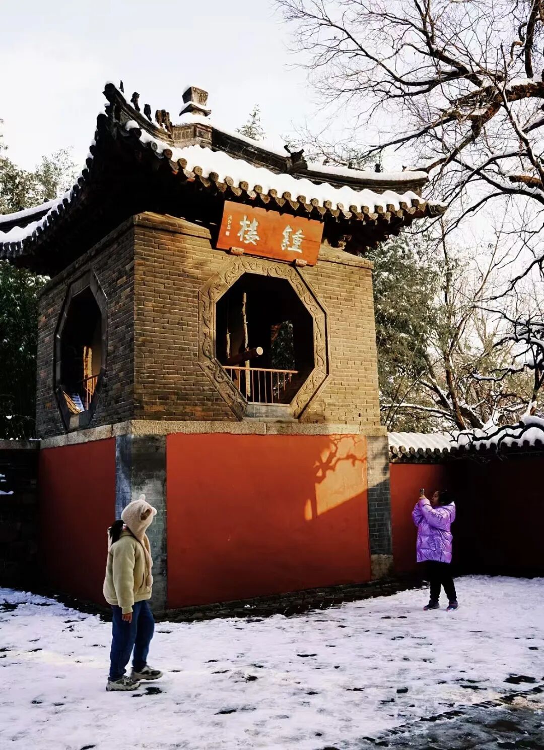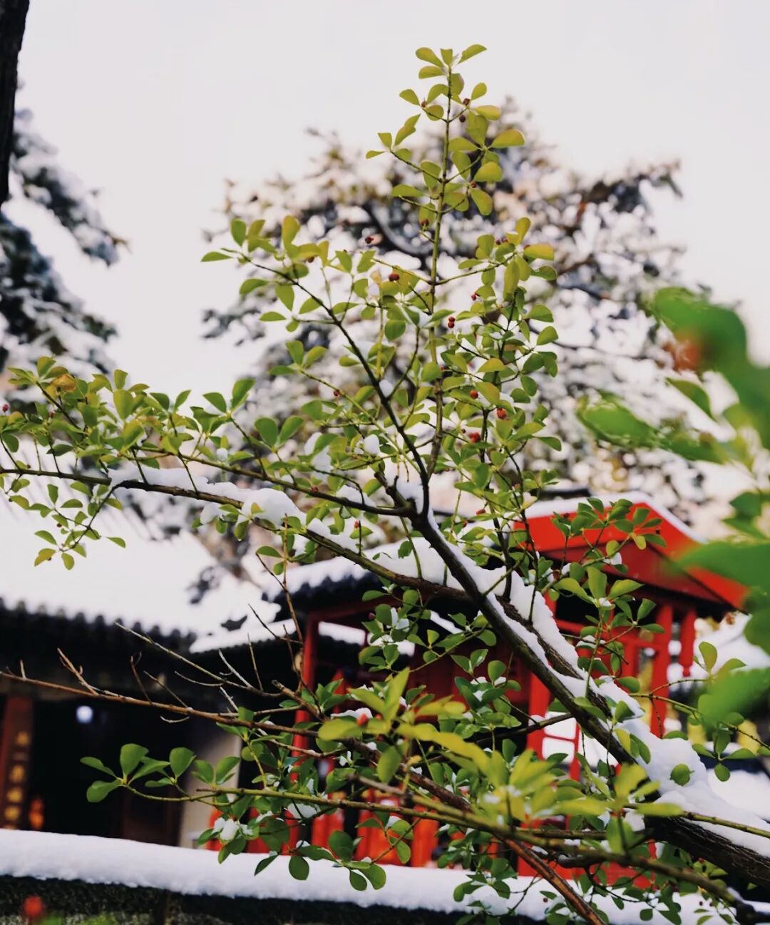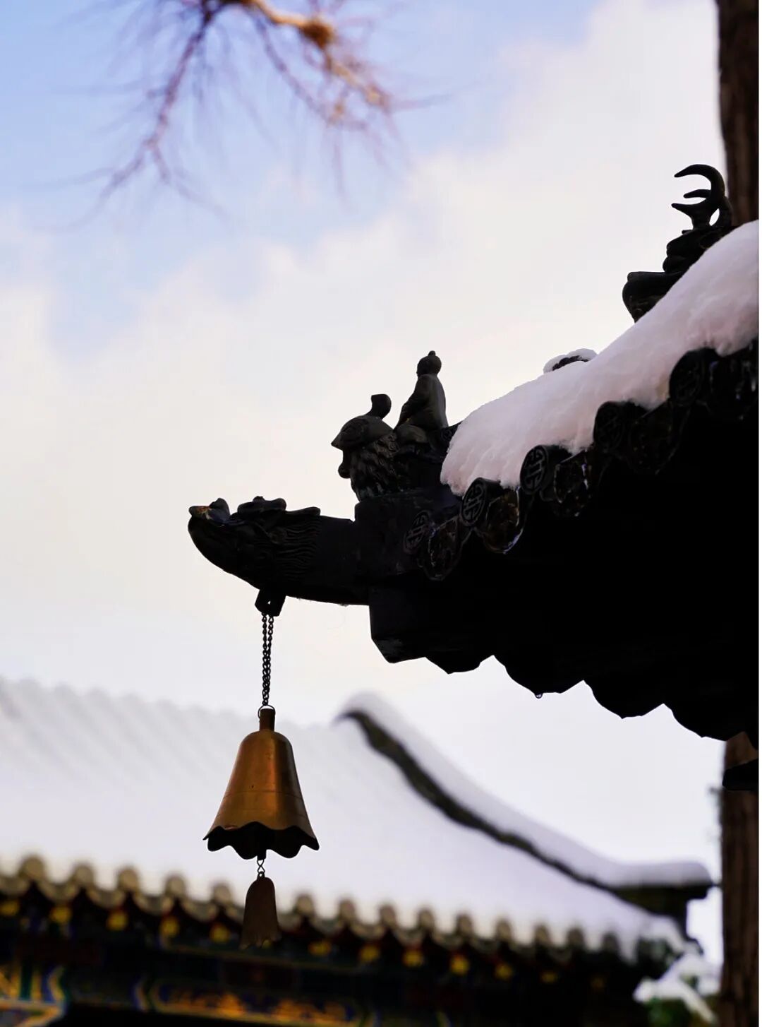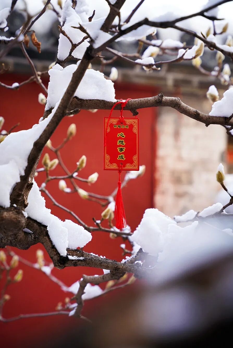 朱紅亭臺裹在雪色里,飛檐翹角的弧度被柔化,檐下懸著的銅鈴偶爾在風里輕晃,傳出細碎又清透的聲響。