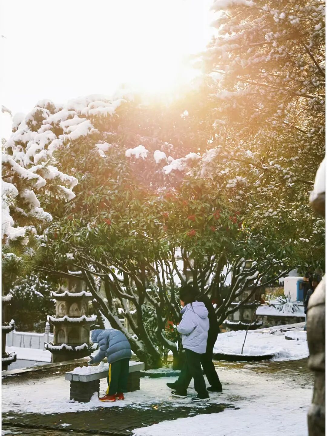 待日頭漸高,晨光終于穿透云層,斜斜灑進庭院。陽光落在古柏的銀枝上,瞬間折細碎的光,照在亭臺的雪堆上,素白的雪面泛著暖融融的光澤。