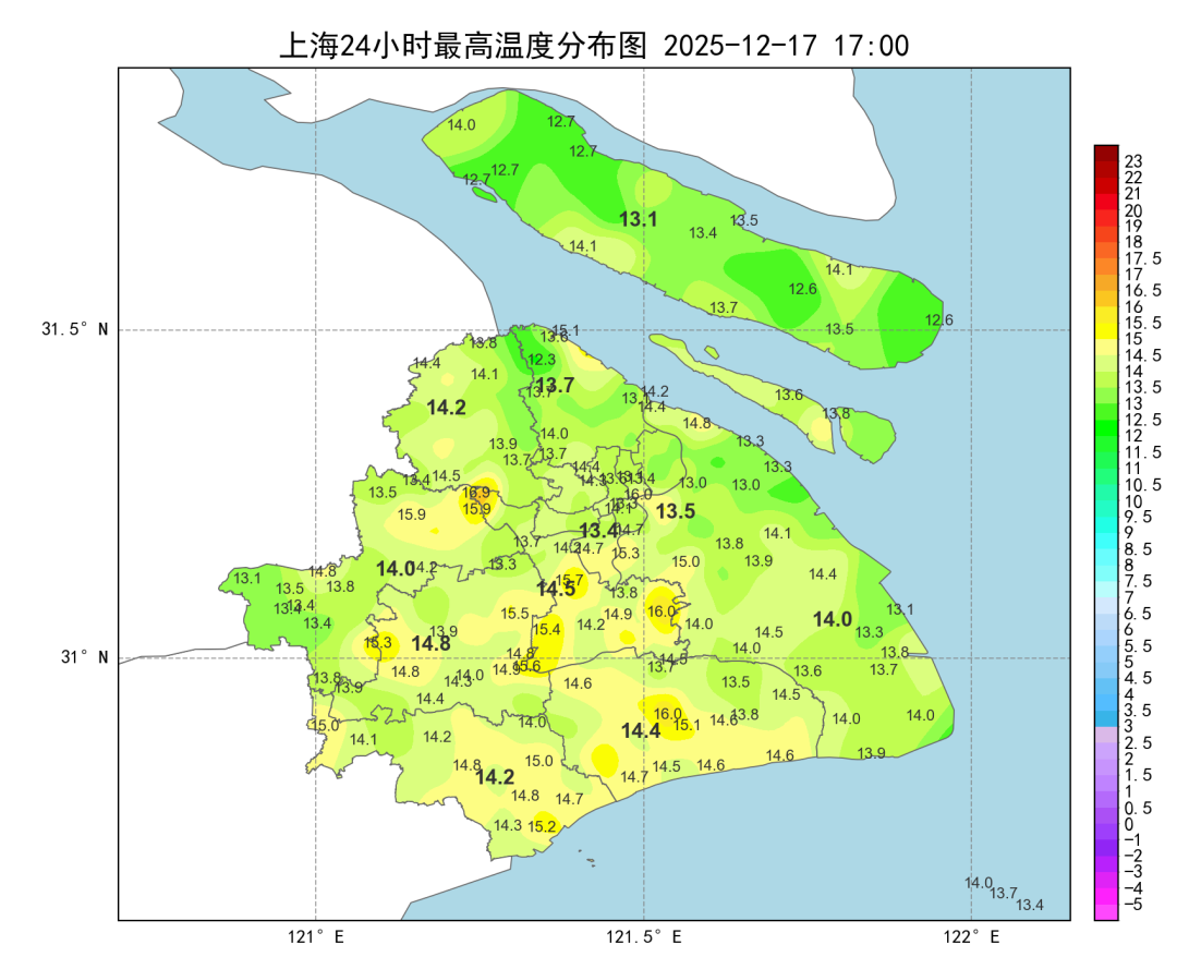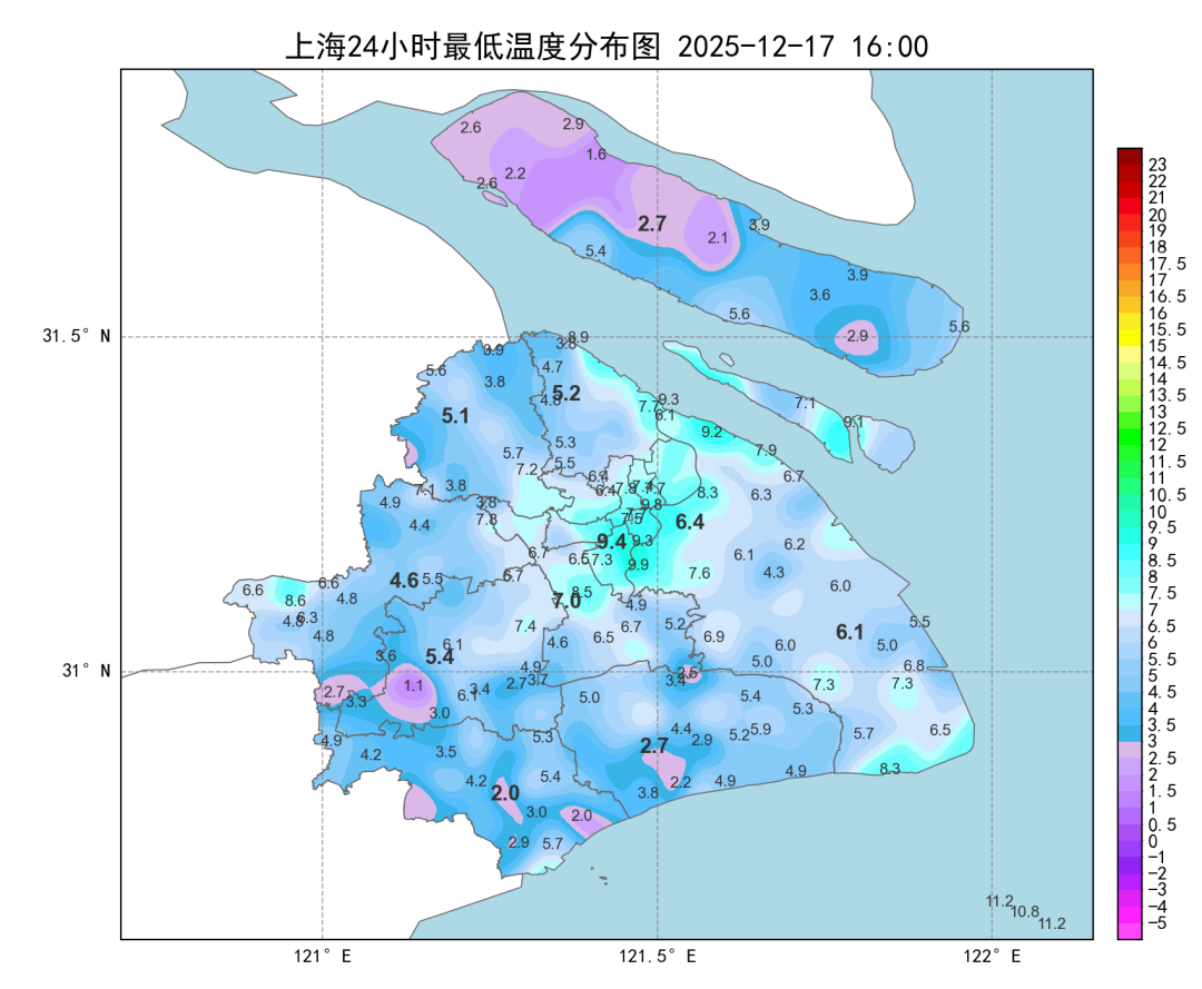 受輻射降溫影響,今天早間全市最低氣溫城郊差異明顯,市區徐家匯站9.4度,郊區大多在2~10度之間,金山2.0度為最低。受冷空氣擴散影響,白天多云天氣為主,午后天空漸漸打開,陽光露臉。最高氣溫較昨日小幅下降,全市在12~15度之間,市區徐家匯站13.4度??諝馊耘f比較干燥。
