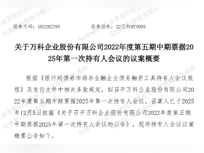 觀點網(wǎng)訊:12月17日,萬科企業(yè)股份有限公司發(fā)布關(guān)于2022年度第五期中期票據(jù)2025年第一次持有人會議的議案概要公告。