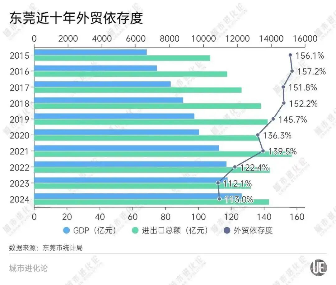 外貿一直被視為衡量東莞經濟的“晴雨表”。東莞外貿依存度(進出口總額/GDP)一度超過400%。2024年,這個數字降至113%,較前些年有明顯下降,但仍是全國外貿依存度最高的城市之一,在萬億城市中僅次于深圳(122.4%)。