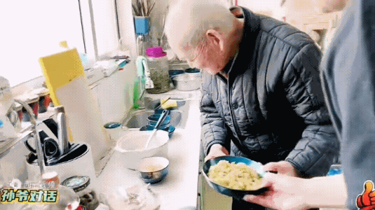 爺爺了解孫子,全不理會,自己去廚房找飯,孫子發(fā)現(xiàn)被爺爺識破,只好過來幫爺爺端過來。