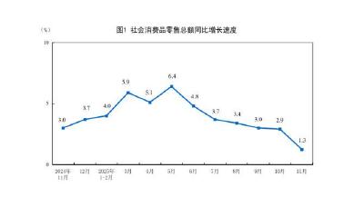 國家統計局:11月份社會消費品零售總額增長1.3%