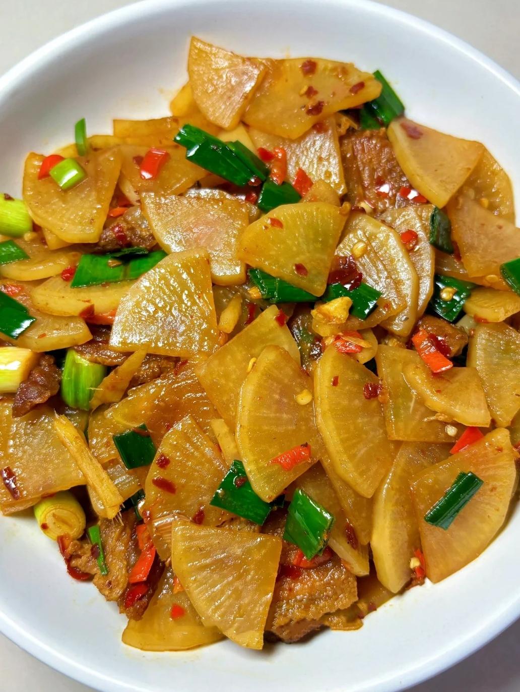 第二道:五花肉炒白蘿卜片——香而不膩的“米飯搭檔”