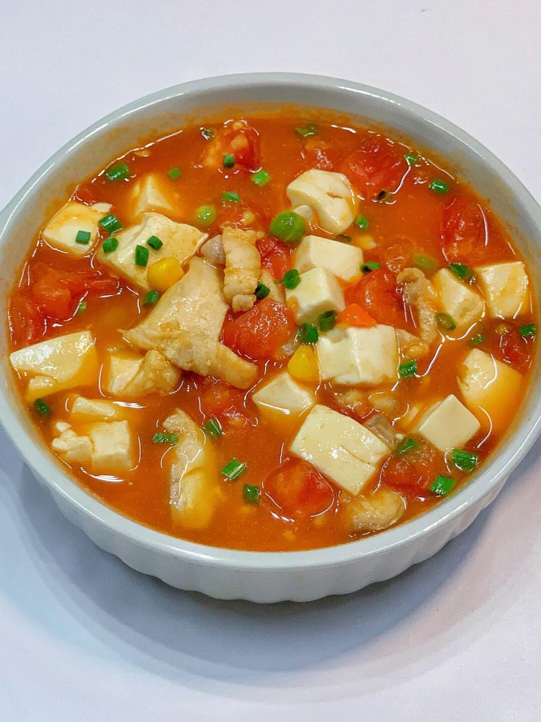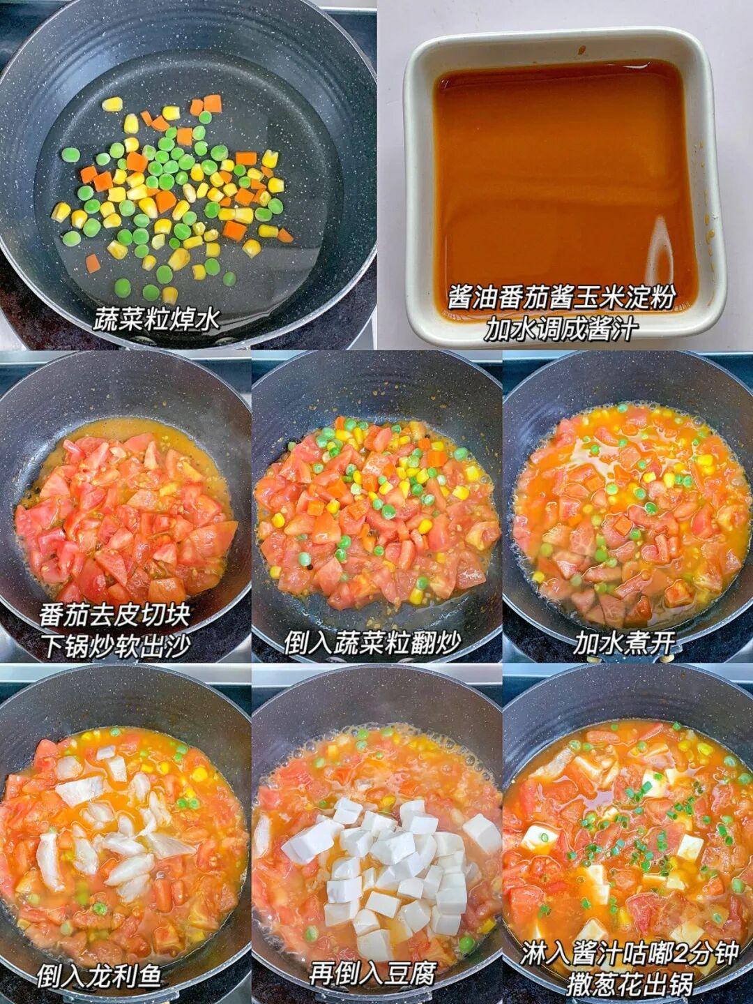 龍利魚、番茄、豆腐、蔬菜粒(胡蘿卜、玉米、豌豆)