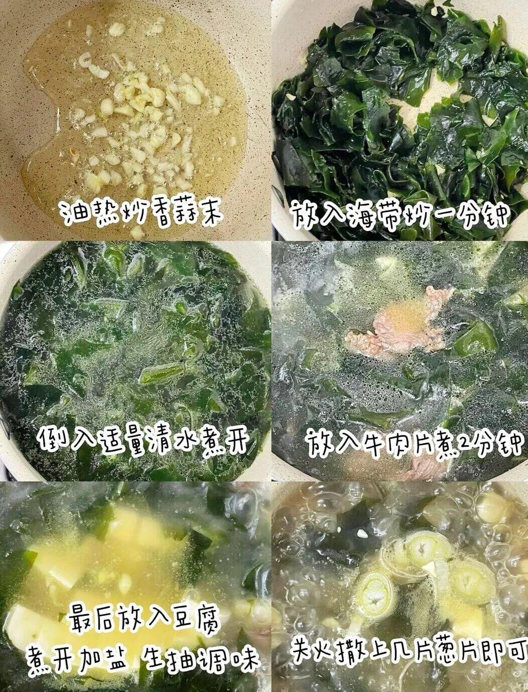 1??、裙帶菜提前放入清水泡發(fā)再切小塊,牛肉洗干凈逆紋切薄片,放入適量生抽、紅薯粉、姜片抓勻腌制20分鐘。