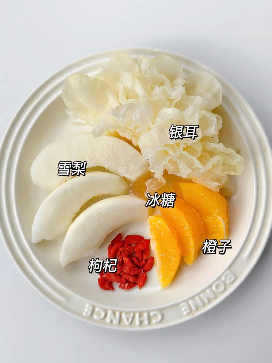 1??、銀耳提前泡軟剪碎,橙子和雪梨去皮洗凈切塊,備好枸杞。
