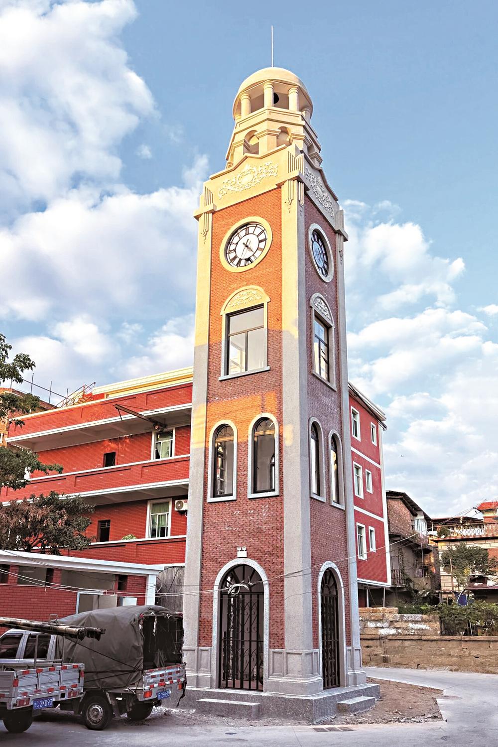 步入街區,一座七層高的塔樓矗立于西側,挺拔而醒目。這座塔樓融合了傳統樓閣的典雅形制與僑鄉文化元素,采用南洋風格鐘樓造型,結構精巧、造型典雅。外立面巧妙運用閩南紅磚與雕花裝飾,細節之處盡顯閩南古韻與南洋風情。塔樓不僅在形態上延續了傳統樓閣之美,更通過細部裝飾承載起深厚的僑鄉記憶,成為連接歷史與當代、鄉土與海外的重要視覺與文化符號。