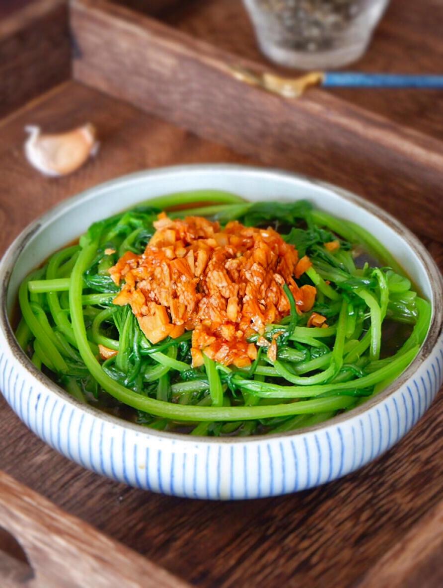 【食材】:茼蒿1把、黃豆醬2勺、大蒜2瓣、小米辣1個(可選)、生抽1勺、白糖少許、食用油適量