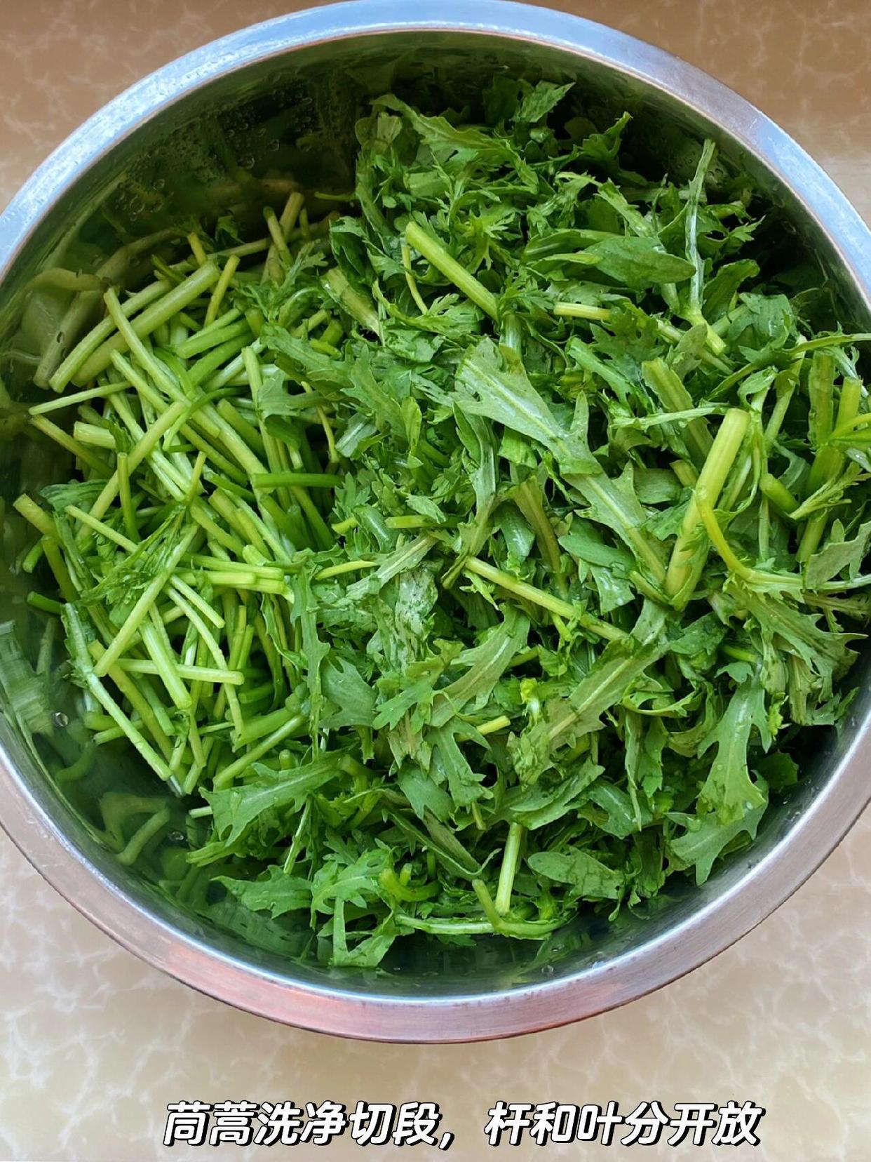 1. 茼蒿洗凈切段,大蒜切末,小米辣切圈;