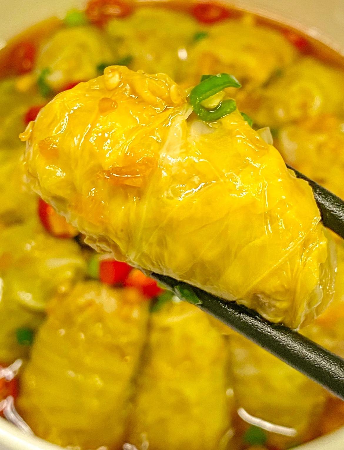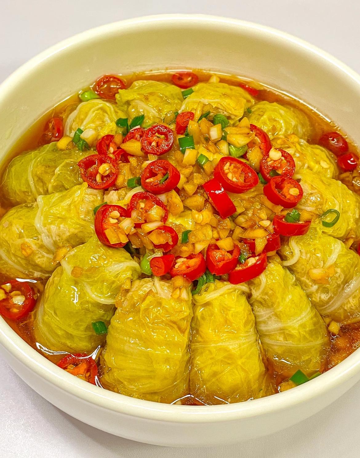 4、蒸好后將盤中的湯汁倒入小碗。另起碗放入蒜末、小米椒、蔥花,澆上熱油激香,再加入生抽、蠔油和蒸出的原湯,拌勻即成調味汁。將調好的醬汁均勻淋在白菜卷上即可。