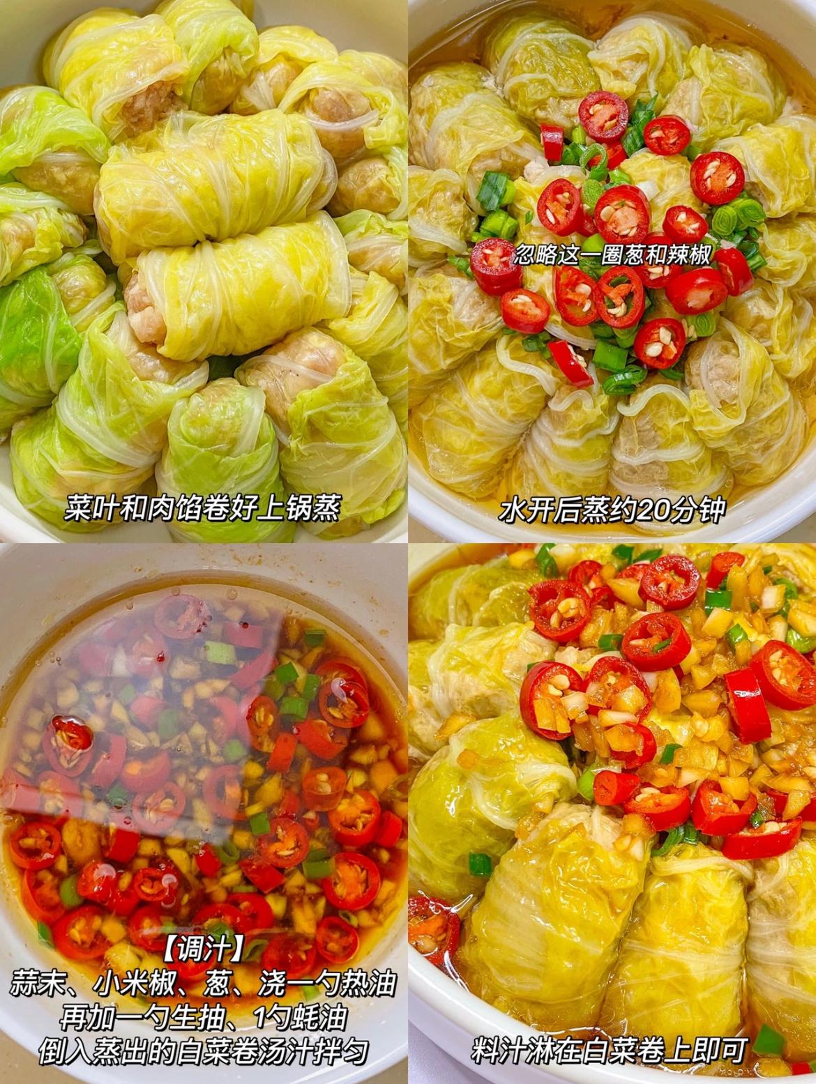 3、取一片白菜葉,放上適量肉餡,卷起成筒狀,收口朝下碼入盤中。水開后放入白菜卷,中火蒸約20分鐘至熟透。