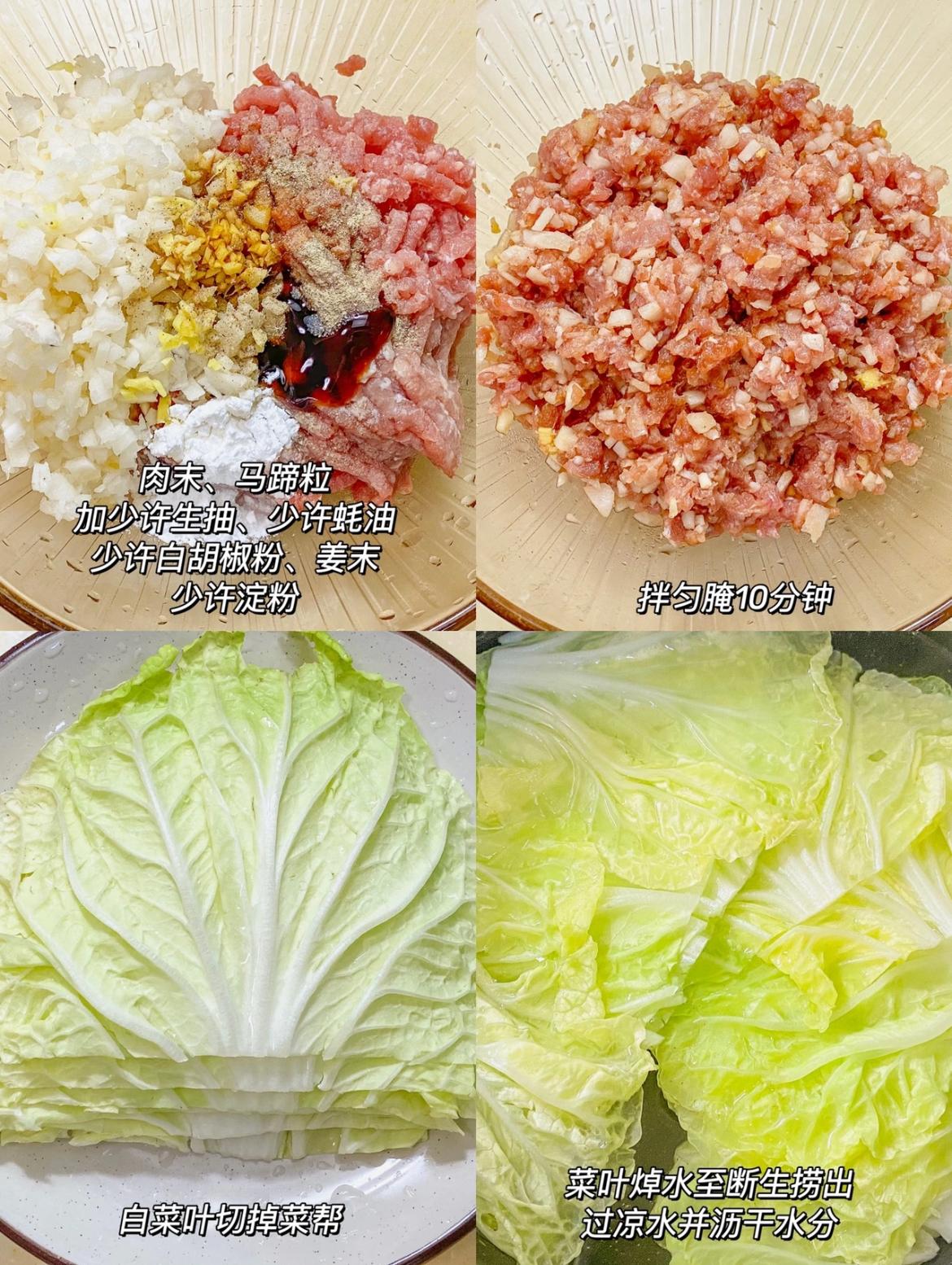 白菜葉 8-10片、豬肉末 200克、馬蹄 4-5個(切碎粒)、姜末 1小勺、淀粉 1小勺