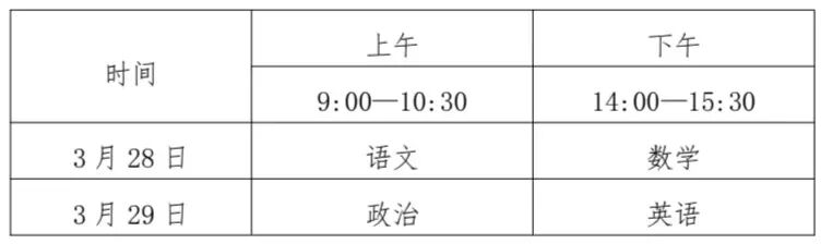 1.考試科目:語文、數學、政治、英語四科,每科滿分150分,四科滿分為600分,使用國家通用語言文字作答。所有考生必須參加普通高考報名所在省級招生考試機構組織的文化考試。考試時間為2026年3月28日至3月29日。考生于2026年3月21日12:00后登錄“體育單招系統”打印文化考試準考證,依據準考證上的考點信息參加文化考試。