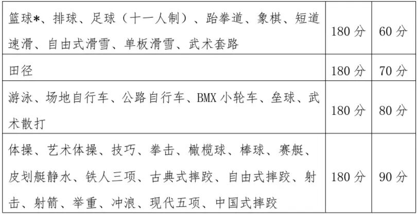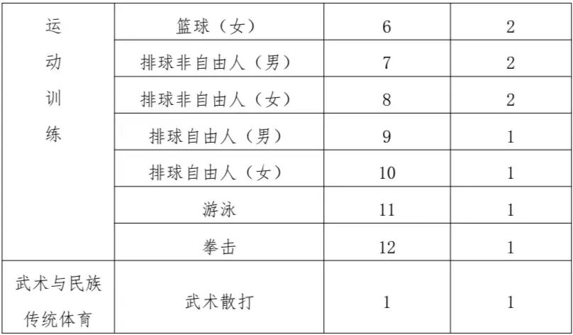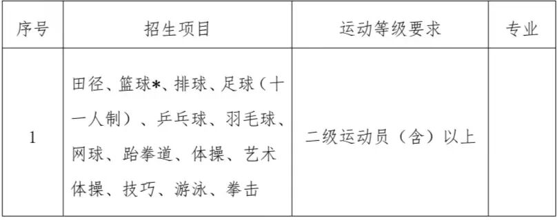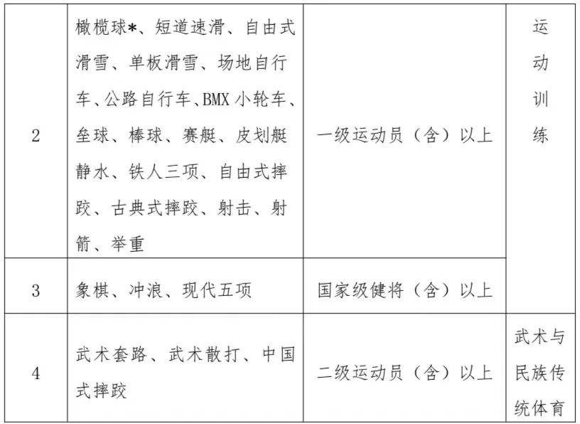 (注:籃球項目考生使用籃球或三人籃球運動員技術等級證書均可報名,按照籃球項目考試方法與評分標準參加籃球專項考試。橄欖球項目考生使用七人制或十五人制橄欖球運動員技術等級證書均可報名,按照七人制橄欖球考試方法與評分標準參加橄欖球專項考試。)