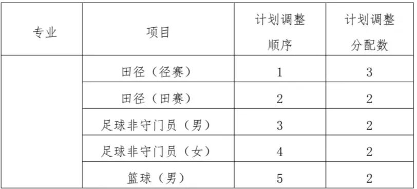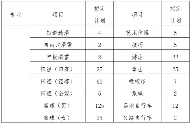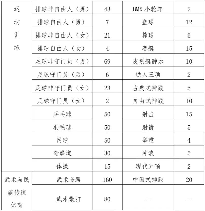 (四)我校采用按項目設置招生計劃,其中田徑項目按田賽、徑賽、全能三類分別錄取;排球項目按非自由人、自由人分別錄取;足球項目按非守門員、守門員分別錄取。足球、籃球、排球項目按男女分別錄取。其他項目不分男女和小項錄取。
