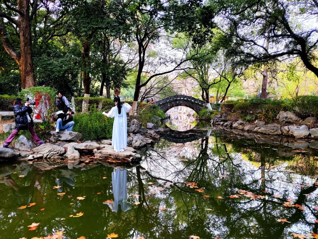 冬日的人民公園,池水如鏡攬住橋影與樹影,一襲白衫的身影立在石畔,快門聲響間,把這份江南冬韻的溫婉,定格成了最美的畫面。
