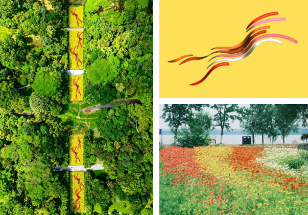 花海整體采用百日草和孔雀草進行波浪式條帶布局,由近及遠、層層遞進。