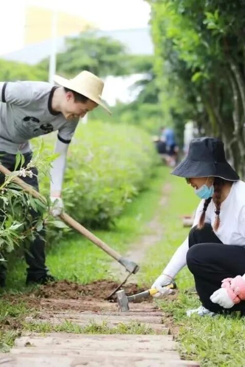 分工合作,確認種植區域后完成脫盆、挖土穴及種植對應花卉