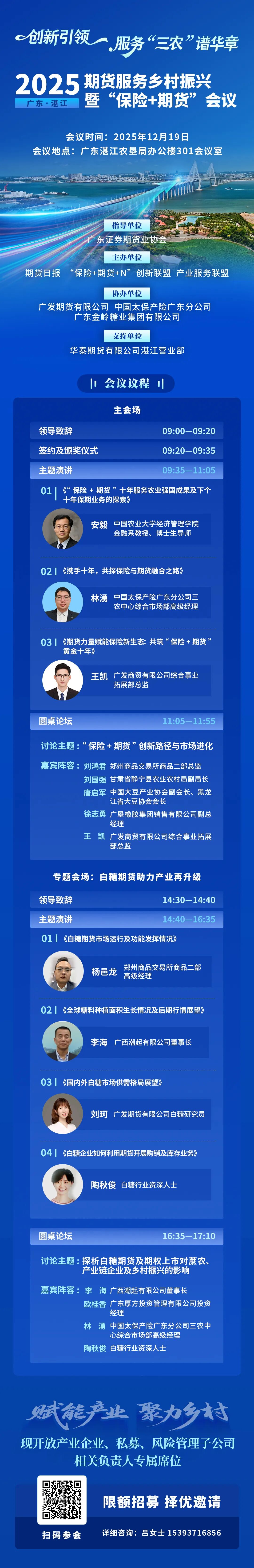 全面推進鄉村振興、加快建設農業強國,是黨中央著眼全面建成社會主義現代化強國作出的戰略部署。鄉村振興離不開金融的有力支撐。黨的二十大報告明確提出,“全面推進鄉村振興,健全農村金融服務體系。”在此背景下,由期貨日報、“保險+期貨+N”創新聯盟、產業服務聯盟聯合主辦的“2025期貨服務鄉村振興暨‘保險+期貨’會議”將于12月19日在廣東省湛江市舉行。