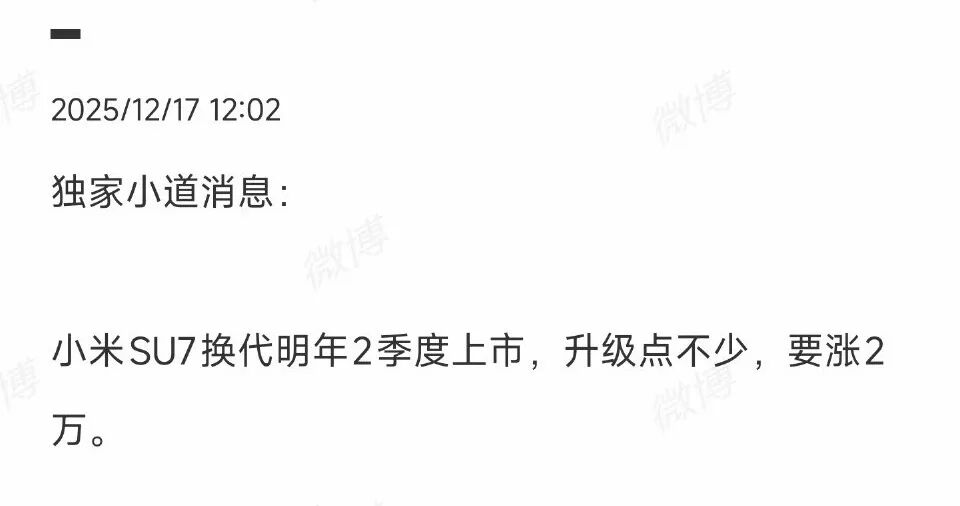 近日,有爆料稱,小米SU7換代車型,預計2026年二季度上市,全系或漲價2萬元。