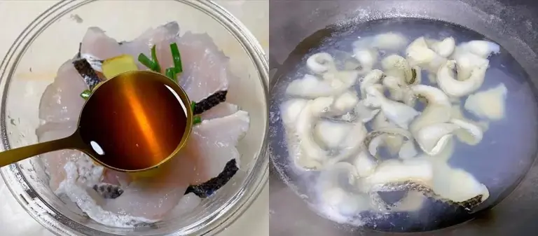 2、在魚片腌制的這 15 分鐘里,把鍋拿出來,添上點水,然后開火煮。等水開了之后,就可以把腌制好的魚片放進去了燙 35 秒,35 秒一到,馬上把魚片撈出來。