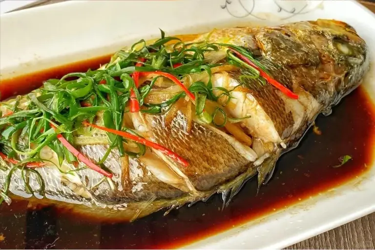 時間到了,把蒸好的鱸魚從鍋里拿出來,把這些湯汁倒掉,再往魚身上倒入 15 毫升蒸魚豉油,把小蔥切成絲,小米辣也切成絲,均勻地撒在魚身上。最后一步澆上一勺熱油就可以享用了。