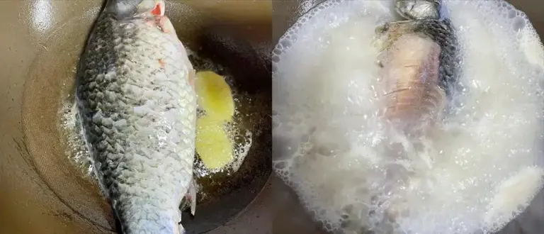 2、下一步起鍋熱油。等油熱了,就把鯽魚和姜片放進去。把鯽魚煎到它底部金黃,然后再給它翻個面。煎過的魚啊,能固定住魚肉,等下煮湯的時候,魚肉就不容易散掉啦。等魚的兩面都煎成金黃了,就可以往鍋里加熱水啦。
