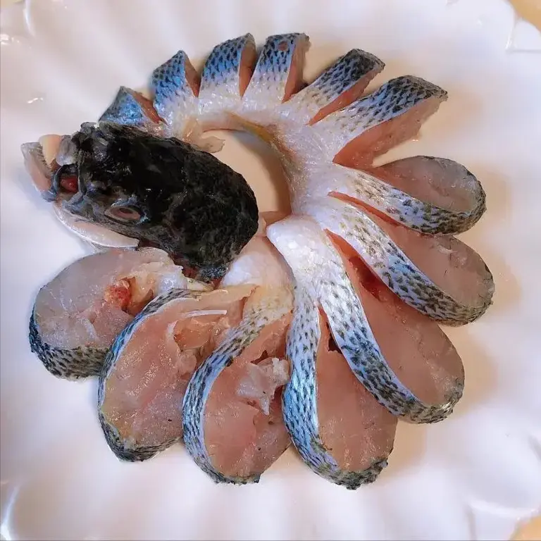 3、把切好的魚片一片片地擺放在盤子里,擺成一個漂亮的造型,就像一朵盛開的花一樣,再把魚頭和魚尾擺在合適的位置,這就有那花開富貴的感覺了。