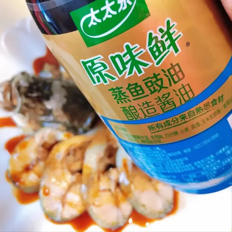4、8 分鐘一到,趕緊把魚從鍋里取出來。把多余的湯汁、姜片和蔥段倒掉。倒掉之后,往魚身上倒上適量的蒸魚豉油。