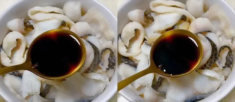 3、把撈出來的魚片放到盤子里開始調味啦!先倒上 2 勺蒸魚豉油,再倒上一勺香醋,香醋能中和一下魚的腥味,還能增添一點酸酸甜甜的味道,讓口感更豐富。然后,再撒上半勺糖,糖不用太多,主要是為了提提鮮。