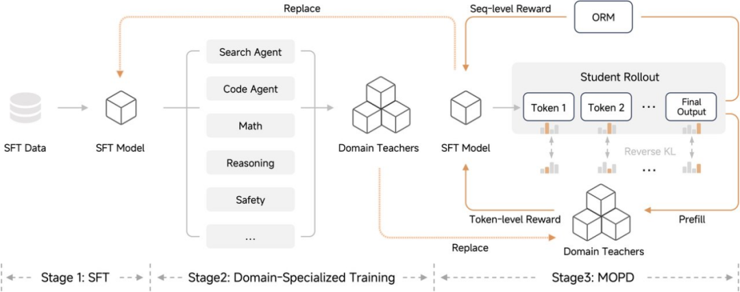 訓(xùn)練流程則采用了MOPD(多教師在線策略蒸餾)的新范式。