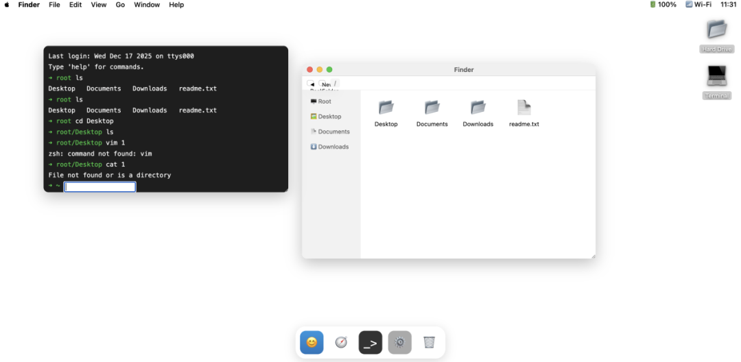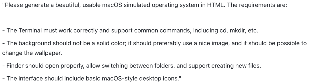 例如在要求用前端代碼構(gòu)建一個網(wǎng)頁版macOS操作系統(tǒng)時,它能一次性生成完整代碼架構(gòu)。