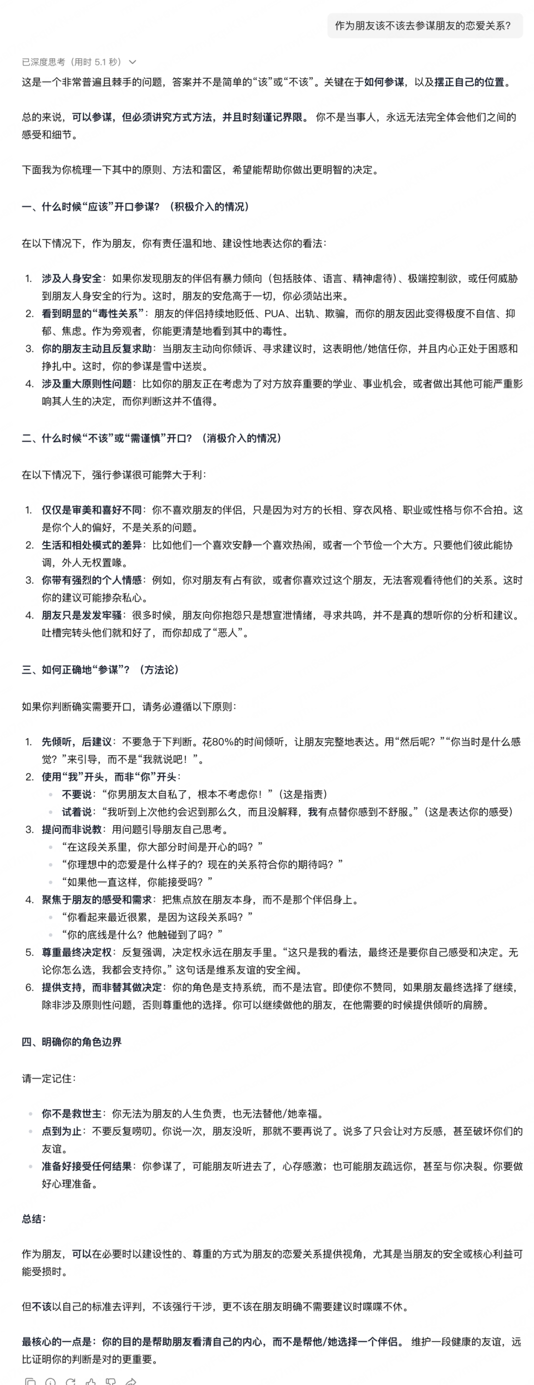 有時候,我們面臨的情感難題,MiMo-V2-Flash也可以給出建議,比如作為朋友該不該去參謀朋友的戀愛關(guān)系。
