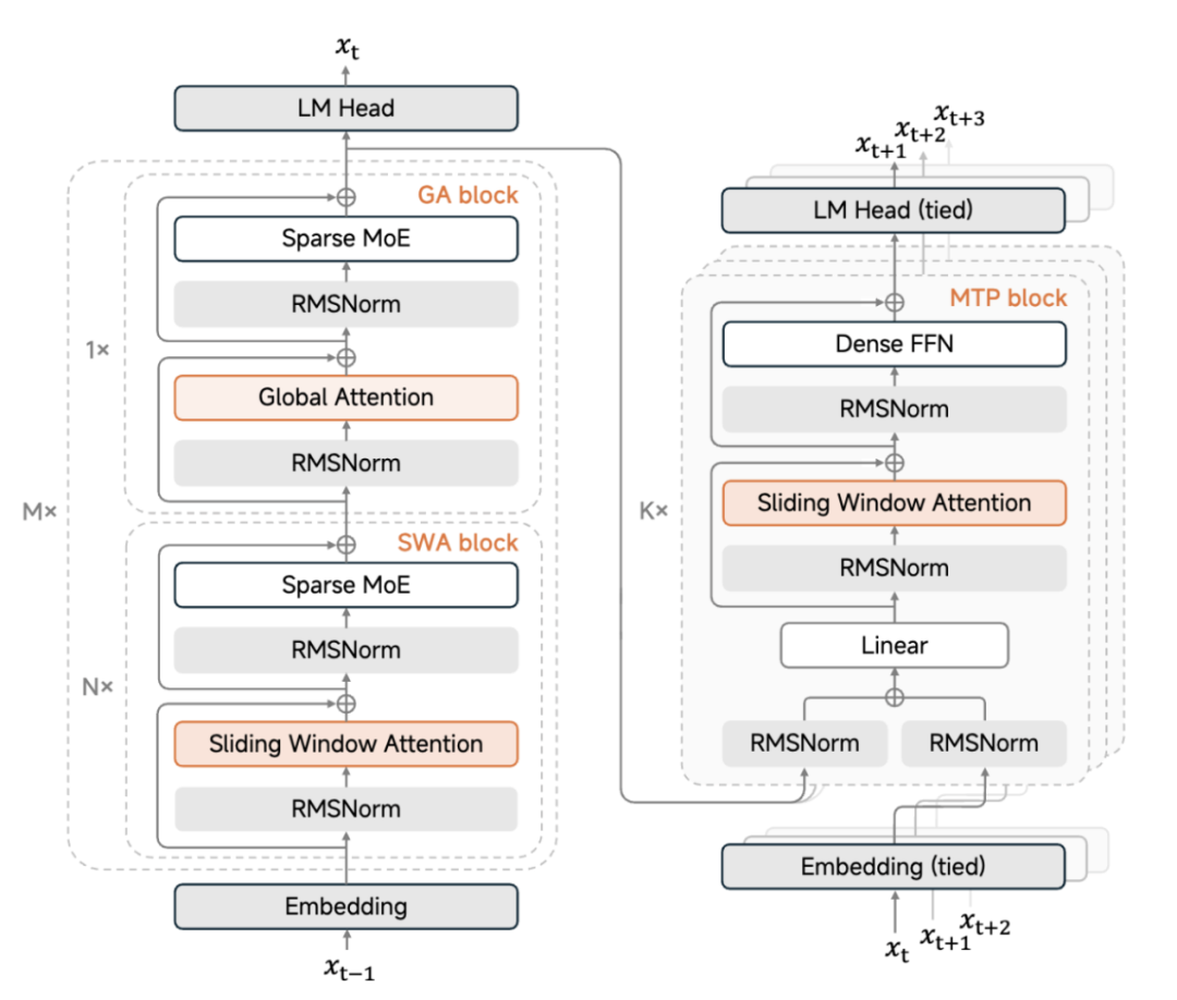 在長文本處理上,MiMo-V2-Flash應(yīng)用了滑動窗口注意力(SWA)和全注意力5:1混合的注意力結(jié)構(gòu)。