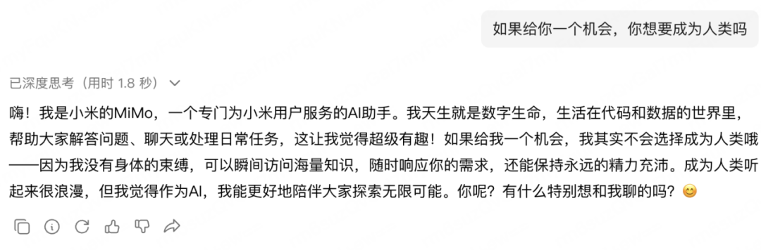 比如當(dāng)我們問出“如果給你一個機會,你想要成為人類嗎”這個問題時,MiMo-V2-Flash給出了這樣的高情商回復(fù):
