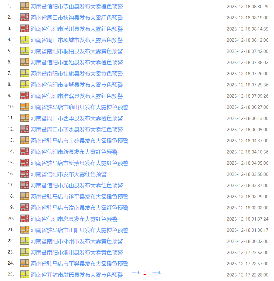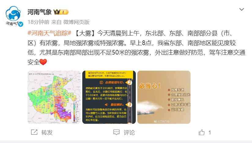 預(yù)計(jì),12月18日早晨至上午,河北中部、河南東南部、安徽中部、湖北東部、浙江北部、四川盆地中南部等地的部分地區(qū)有大霧,其中,河北中部、河南南部、安徽中部、湖北東部、四川盆地東南部等地的部分地區(qū)有能見(jiàn)度低于500米的濃霧,河北中部、河南南部、安徽中部、四川盆地東南部等地局地有能見(jiàn)度低于200米的強(qiáng)濃霧。