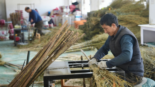 12月16日,走進洛浦縣拜什托格拉克鄉明昊掃把廠,機器轟鳴作響,車間內一派熱火朝天的生產景象。工人們正全力趕制訂單,大家各司其職,嫻熟地捆扎、整形,一根根枝條在指尖快速變身成整齊規范的掃把。