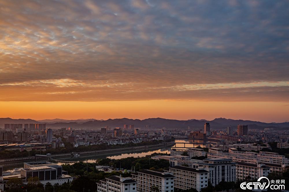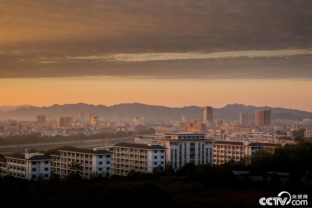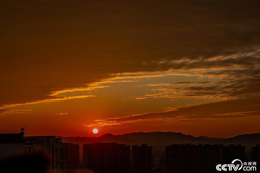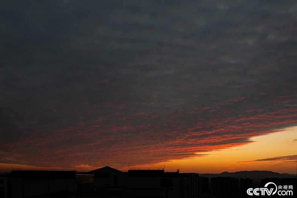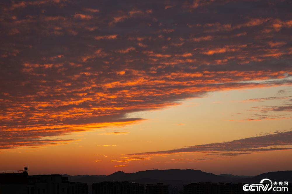 2025年12月17日落日時(shí)分,廣東梅州,天空出現(xiàn)大面積火燒云。視覺中國